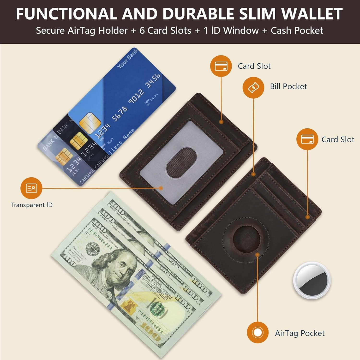 Genuine Leather Slim Wallet with Airtag compartment, Compatible with AirTag
