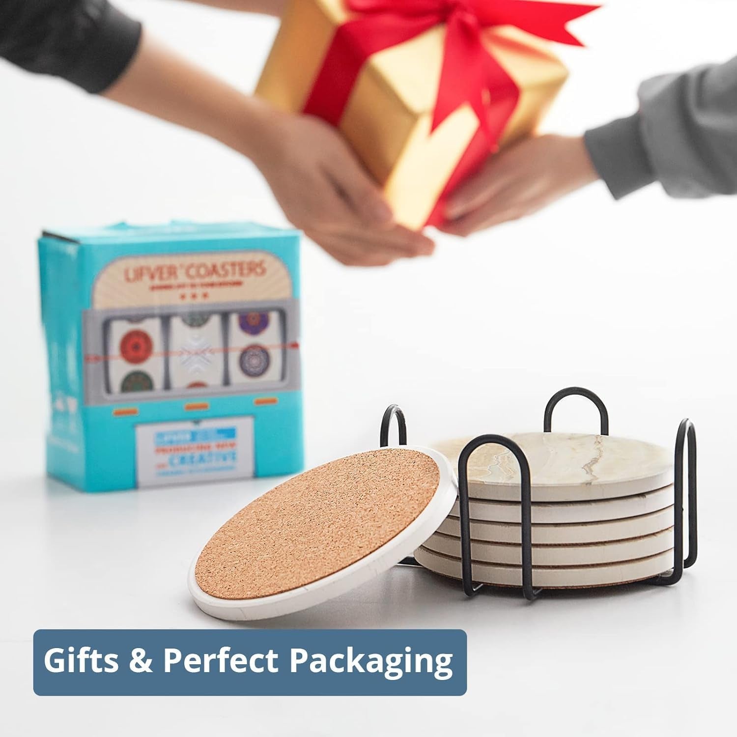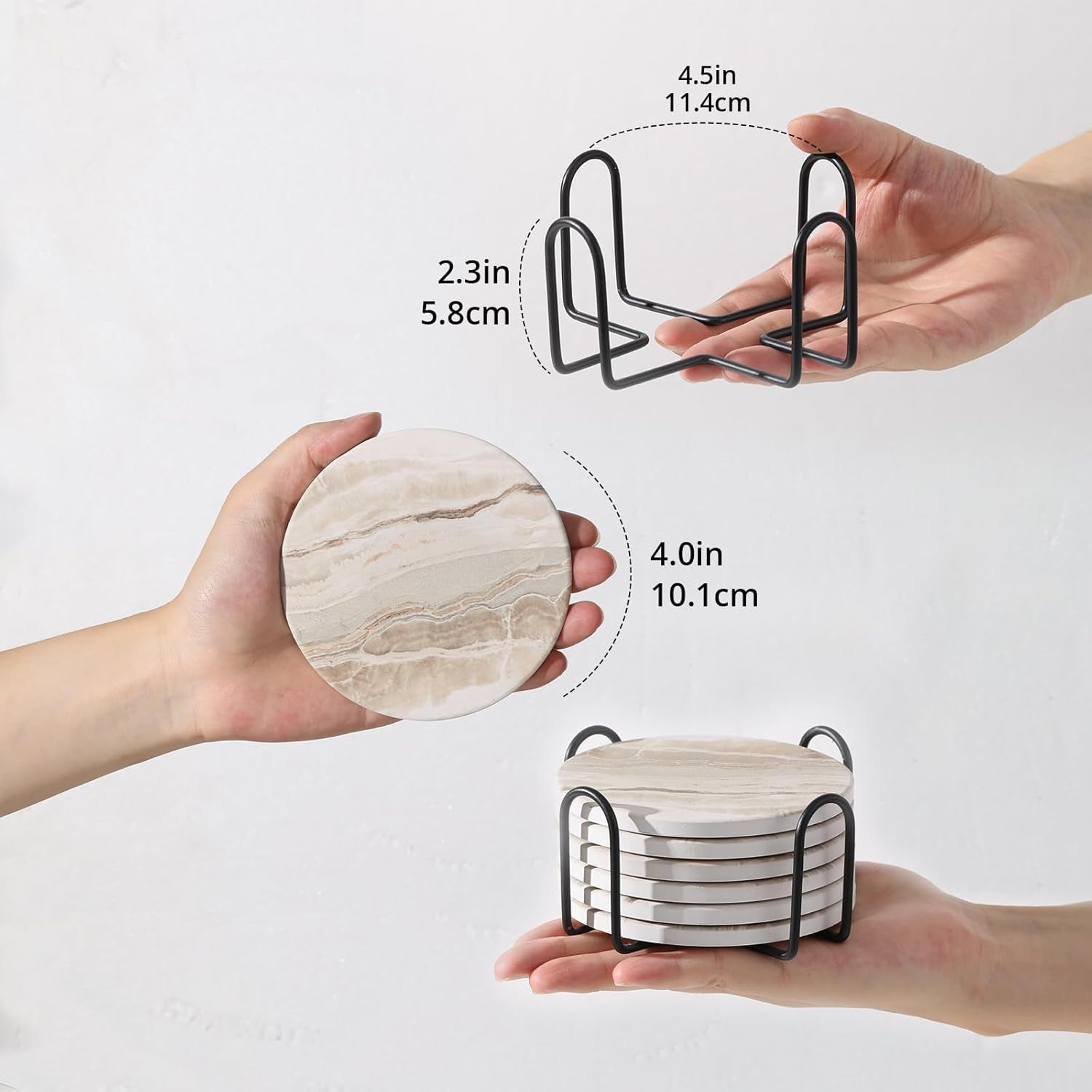 6 Pack Marble Style Ceramic Drink Coasters Set with Non-slip cork backing & Holder