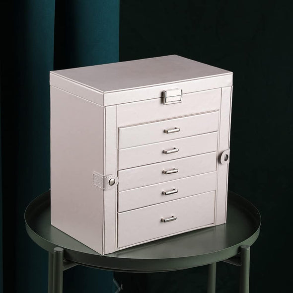 6-Tier PU Leather Jewelry Box with Mirror & 5 Drawers, Pearl White