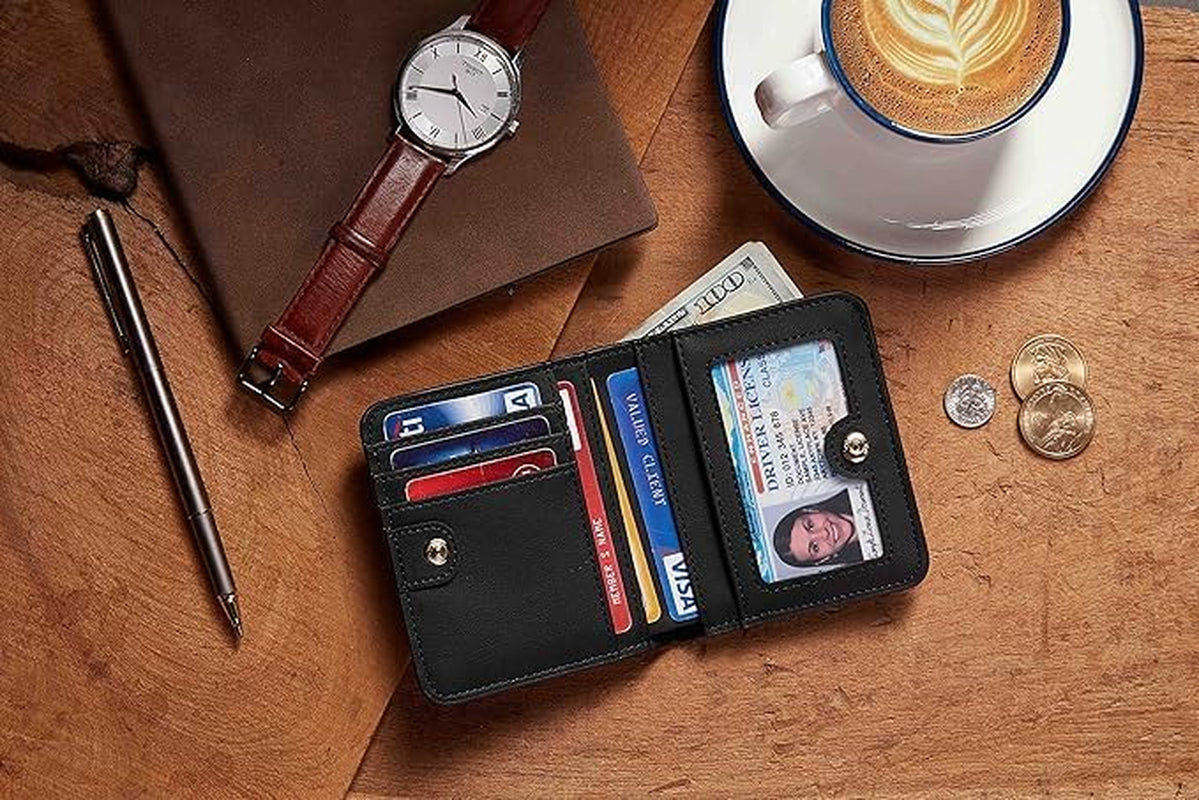 Compact Bifold Credit Card Holder, Leather Zipper Coin Wallets for Women